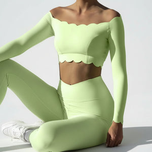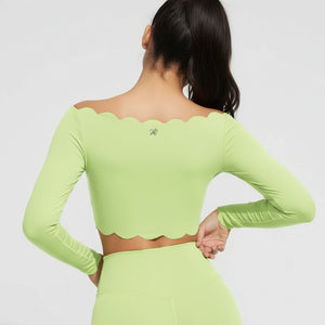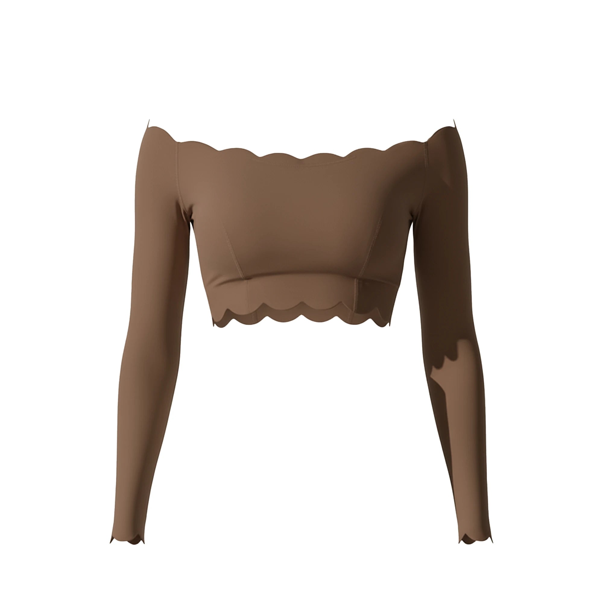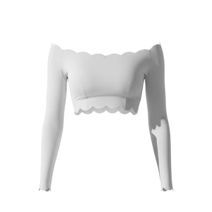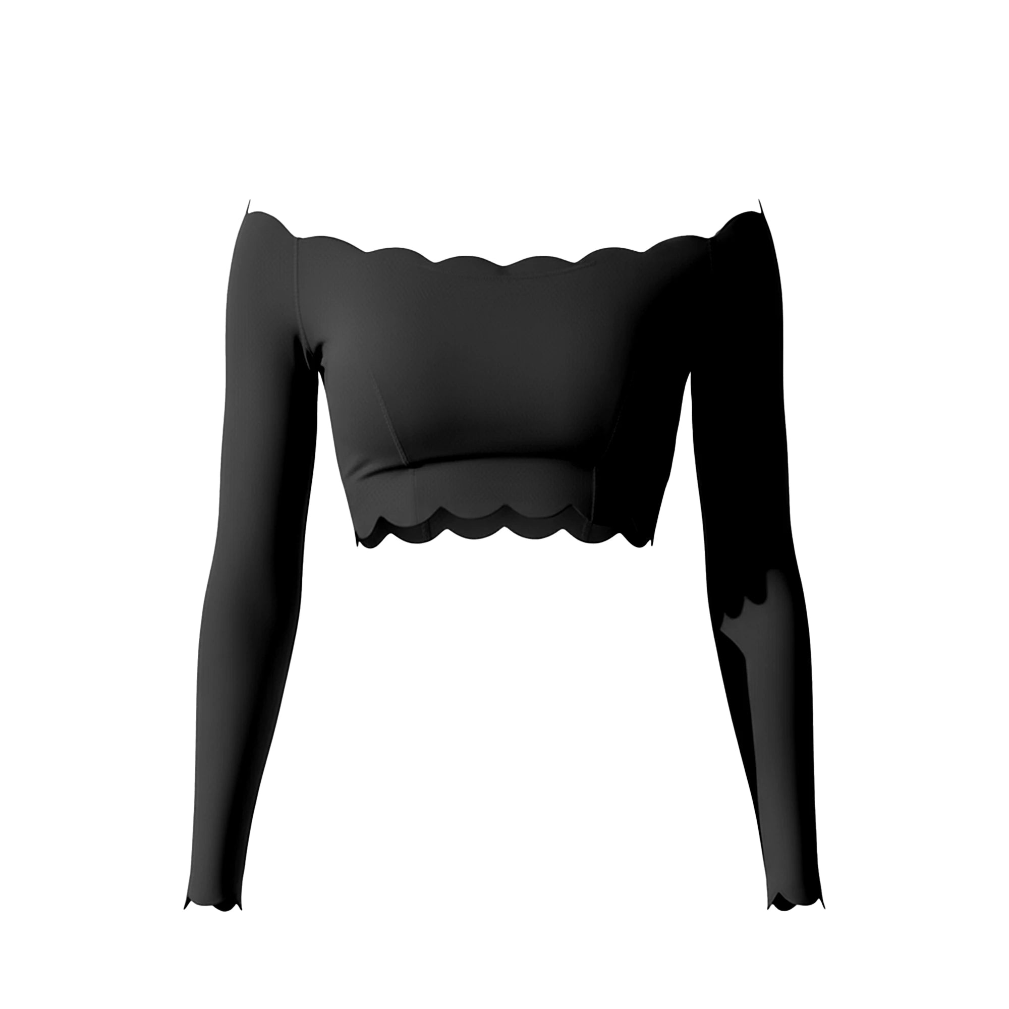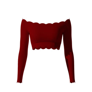 From late afternoon into plans that settle closer to night. The off-shoulder line sits exactly where it should, balanced by long sleeves and a cropped length that keeps the shape intentional. The fabric feels smooth and light on the skin, with scalloped edges that stay put without checking or fixing. It’s the piece you put on knowing the outfit is handled, and leave on as the hours move forward.